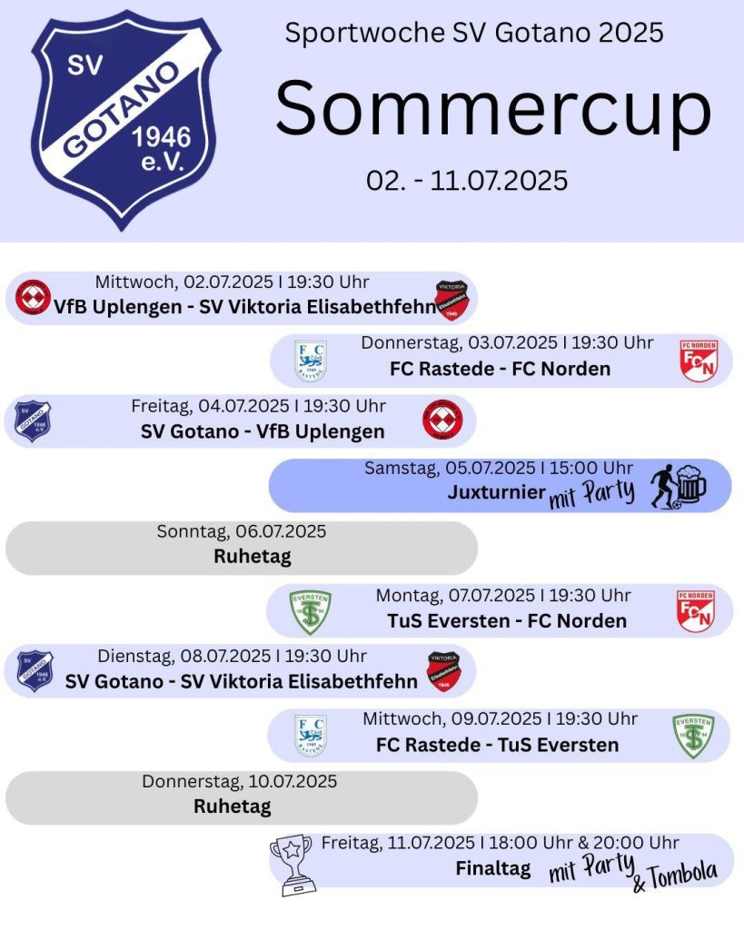 Am 02.07. eröffneten der VfB Uplengen und Viktoria Elisabethfehn das Turnier mit einem 1:1 – ein gelungener Auftakt. Am 03.07. stieg Titelverteidiger FC Rastede ein, unterlag jedoch dem FC Norden mit 1:2. Einen Tag später griff der Gastgeber SV GOTANO ins Turnier ein – mit einem klaren 5:1-Sieg ein starkes Zeichen Richtung Gruppensieg. ![]()
